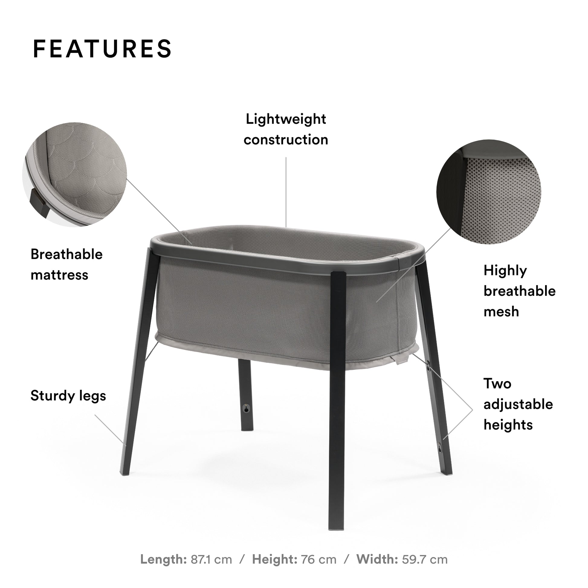 مهد مصمم بعناية لينمو مع طفلك ويمنحه الراحة والأمان في أشهره الأولى. مناسب للأطفال من عمر 0 إلى 9 أشهر، مع مستويين لارتفاع المرتبة ليتكيف مع نمو المولود.
