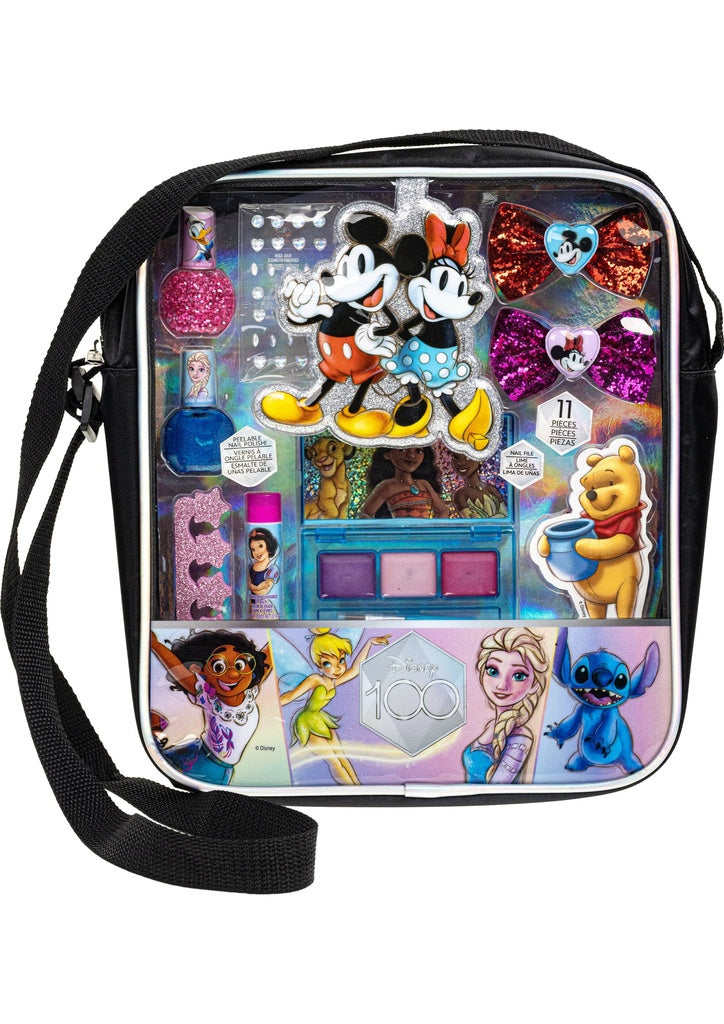 - تتضمن المجموعة: حقيبة كتف مستحضرات تجميل. 3 ملمع شفاه مدمج مع فرشاة بألوان وردية وزرقاء وأرجوانية بنكهة حلوى القطن. 2 ربطة شعر لامعة مع أيقونات ميكي وميني. 2 طلاء أظافر قابل للتقشير باللون الوردي اللامع والأزرق اللامع، وكلاهما برائحة العلكة. 1 مرطب شفاه وردي بنكهة الفراولة. 1 فاصل أصابع دائري الشكل. 1 ورقة من الأحجار الكريمة. 1 مبرد أظافر. كل ذلك في حقيبة كتف.