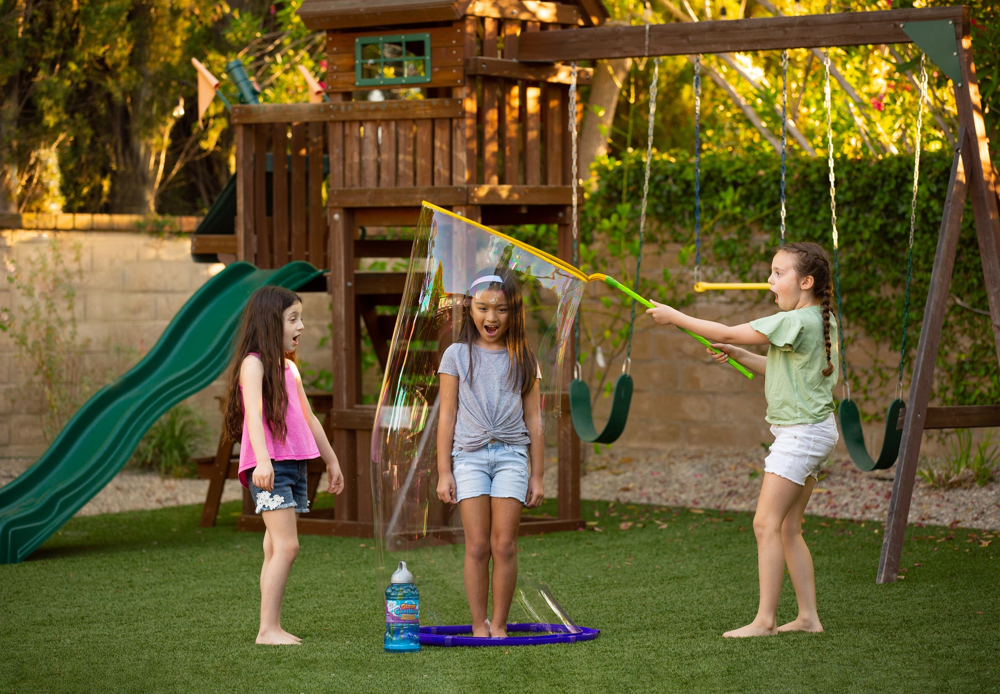 مع لعبة Kid-In-A-Bubble من Giant Gazillion Bubbles®، يمكنك إنشاء فقاعة كبيرة بحيث يمكن للطفل أن يتسع بداخلها! ما عليك سوى ملء الصينية بمحلول Giant Gazillion Bubbles، ثم غمس العصا العملاقة في الصينية، ثم رفعها برفق إلى الأعلى لإنشاء فقاعة عملاقة!