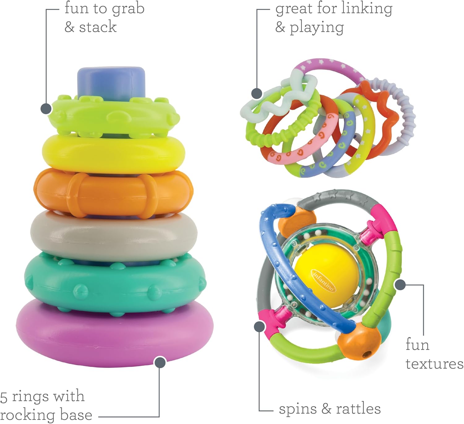 - لعبة 2 في 1 تجمع بين حلقات التكديس وكرة خشخشة دوّارة.