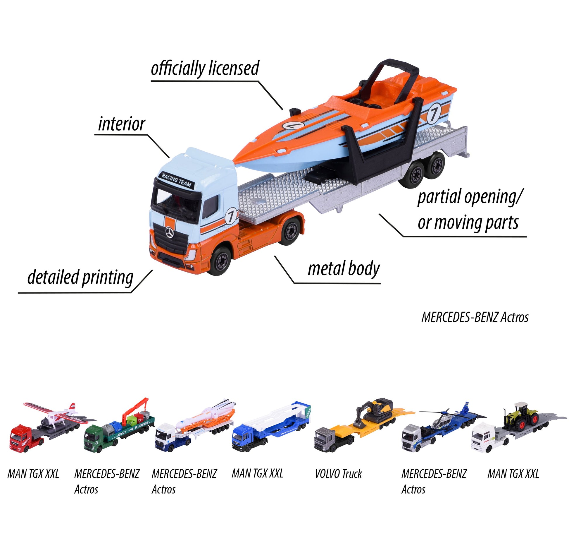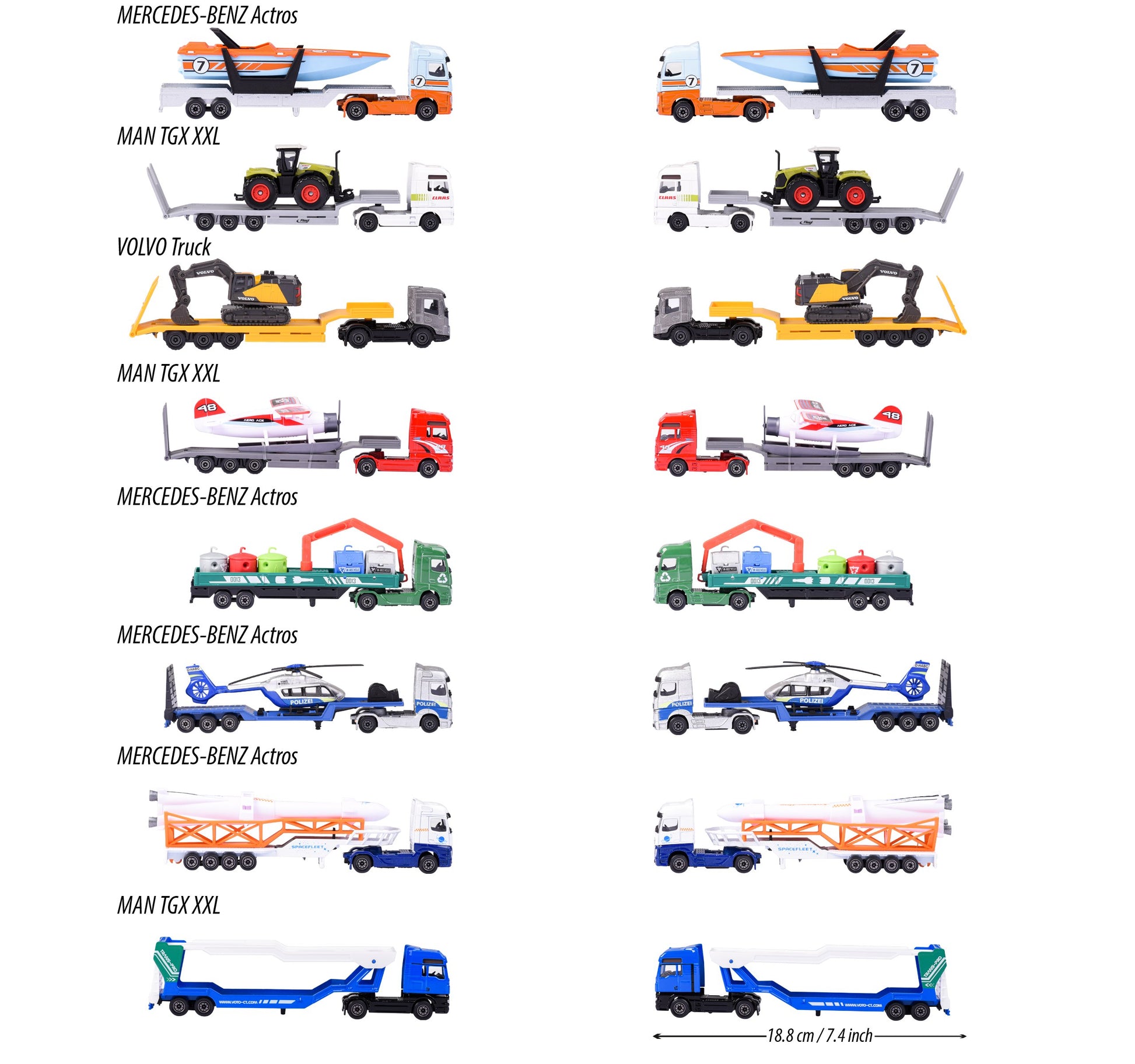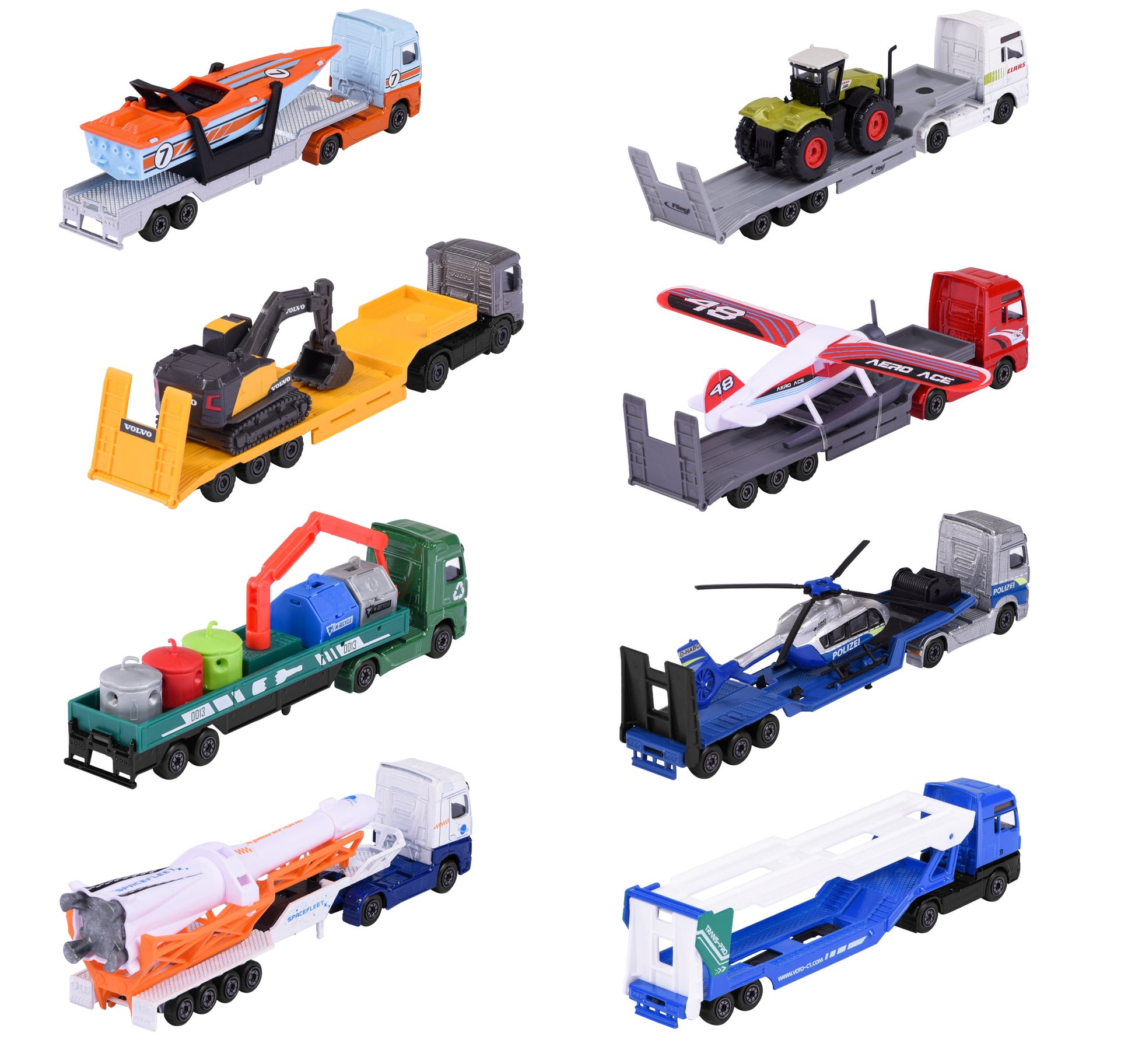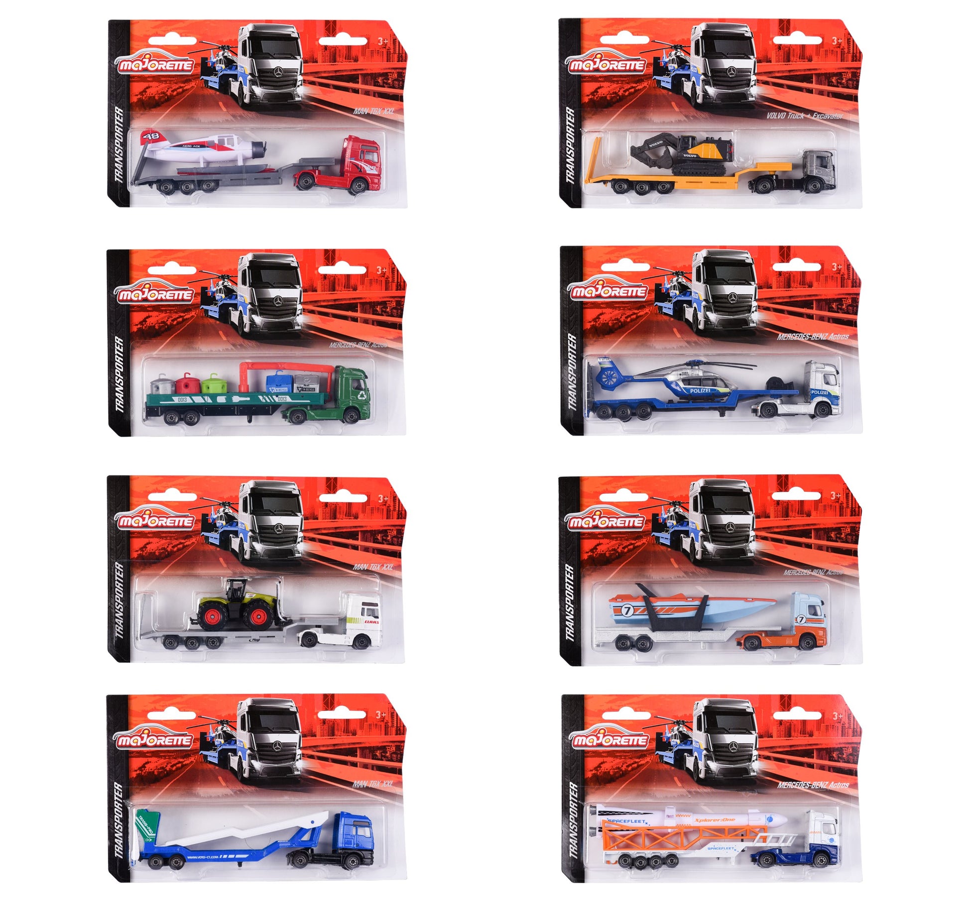 تتميز ناقلات Majorette الستة المختلفة والشاحنات المفصلية والمركبات العملاقة بعظمتها الحقيقية بطول 20 سم ومجموعة متنوعة من الأحمال المختلفة. ويمكن استخدامها كناقلات للطائرات المروحية وحاويات الزجاجات والقوارب والسيارات وغير ذلك الكثير. جميع المركبات مصنوعة من المعدن وتحتوي على أجزاء متحركة. ناقلات Majorette مناسبة للأطفال من سن ثلاث سنوات فأكثر.
