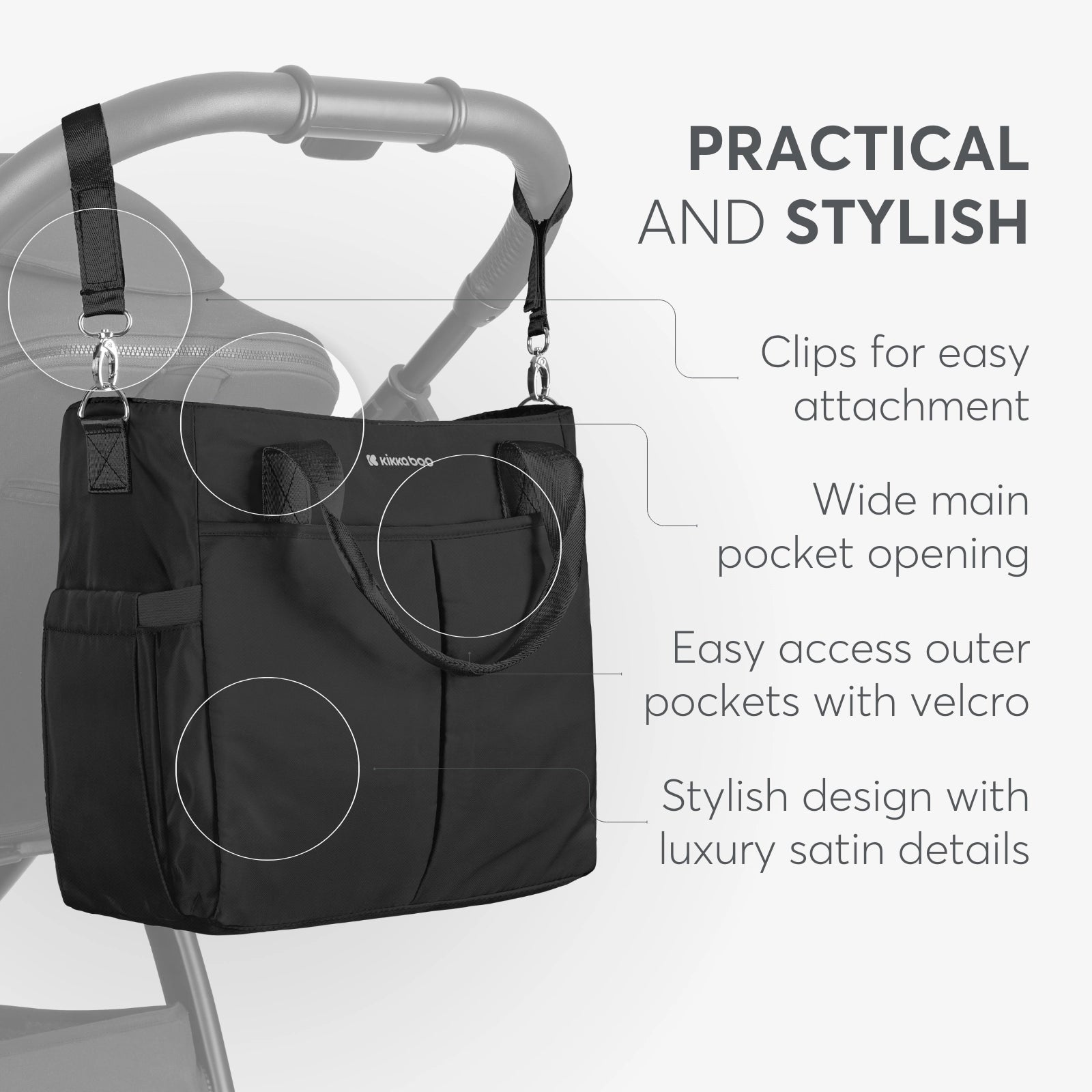 • مشابك لسهولة التثبيت على مقبض عربة الأطفال.
