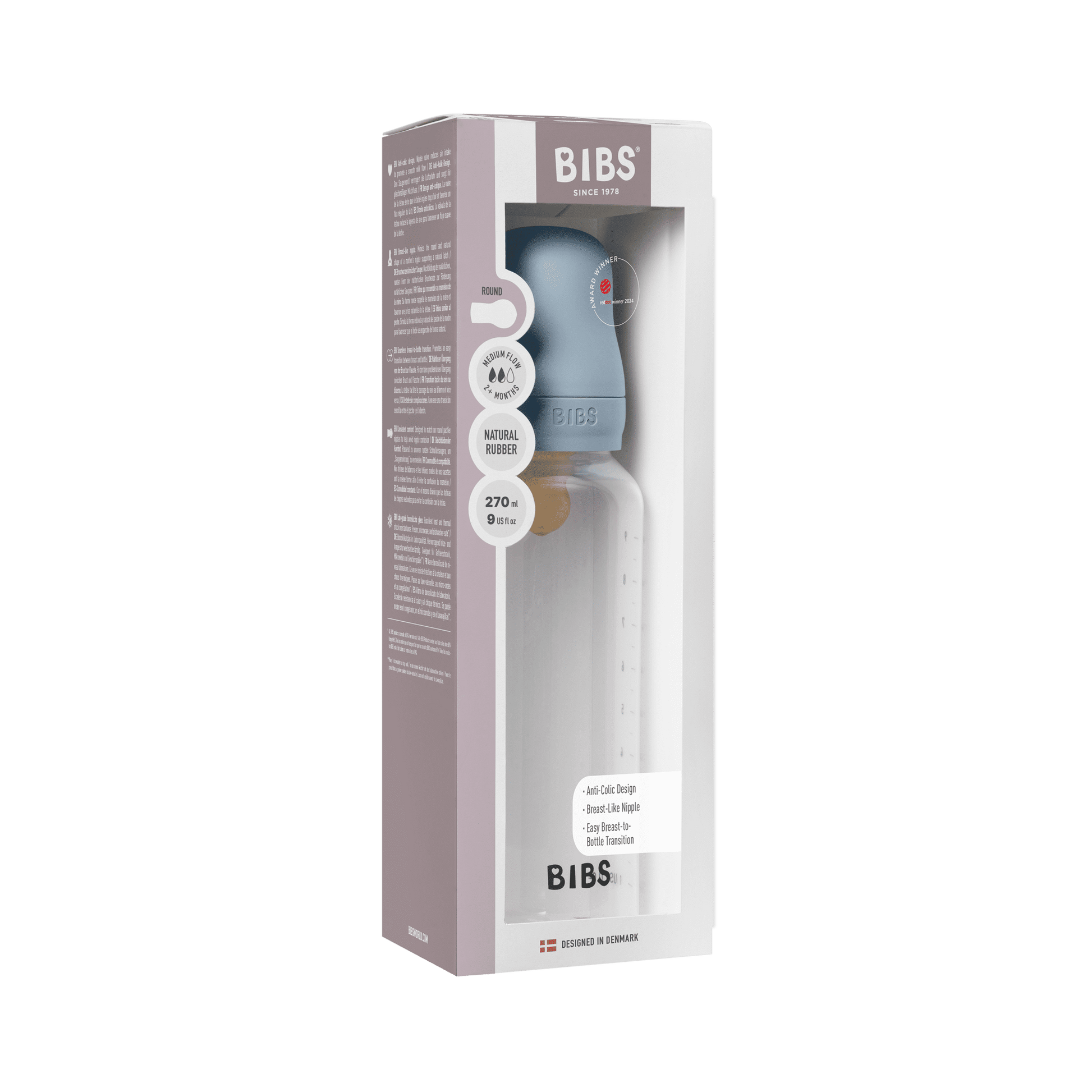 BIBS Baby Bottle Round Nipple Latex 1 Pack 270 Ml Medium Flow-Baby Blue