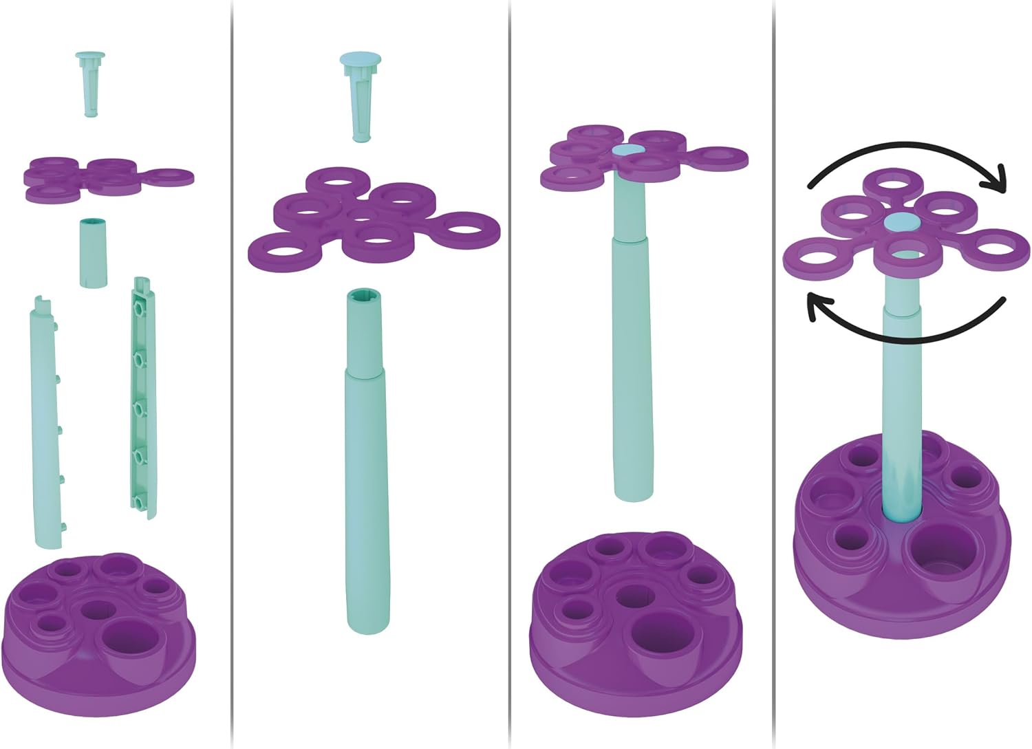 - The structure allows the suspended test tubes to rotate and mix the creations.