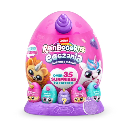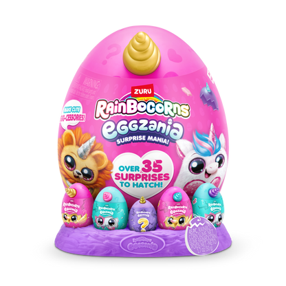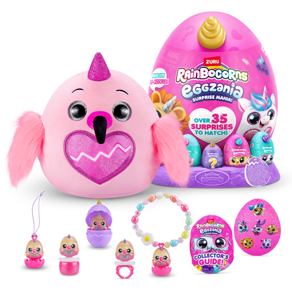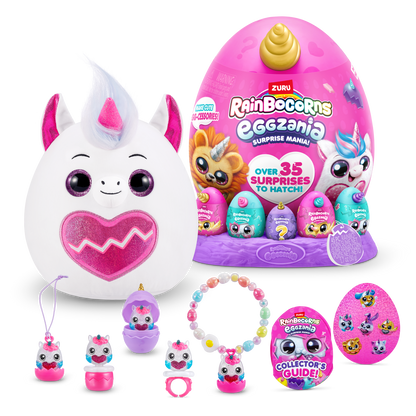 Crack into all-new Rainbocorns Eggzania! This egg is oozing with over 20 surprises and brand new kooky cute Rainbocorns characters. Remove the egg from the nest to hatch your super-squishy Rainbocorns Eggzania plush! There are 6 Eggzania animals to collect including Roary the Lion, Peanut the Elephant and Daffy the Flamingo! Each Eggzania plush comes complete with matching yolkie, 5 mini eggs, stickers, wearable accessories, and an Eggzania joke that will crack you up (if you get the yolk)! Enter Rainboville in style with a ring, stamp and DIY bracelet that match your Eggzania! These silky soft Rainbocorns love to cuddle and will have you seeing life sunny side up! Which Eggzania will you hatch?