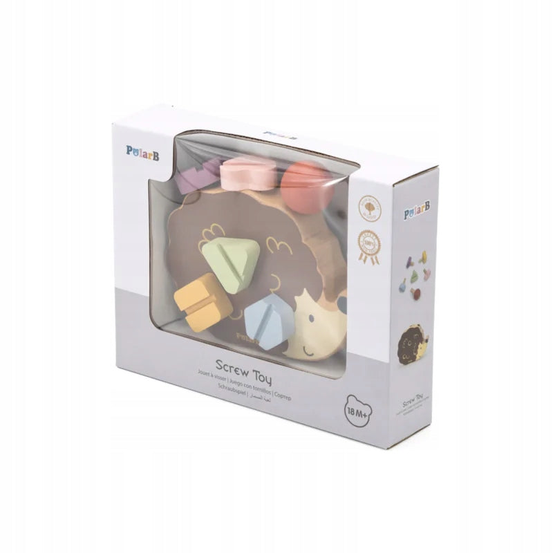 - The set includes a hedgehog with holes, a red ball with a screwdriver and 5 screw-in screws with different colors and head shapes