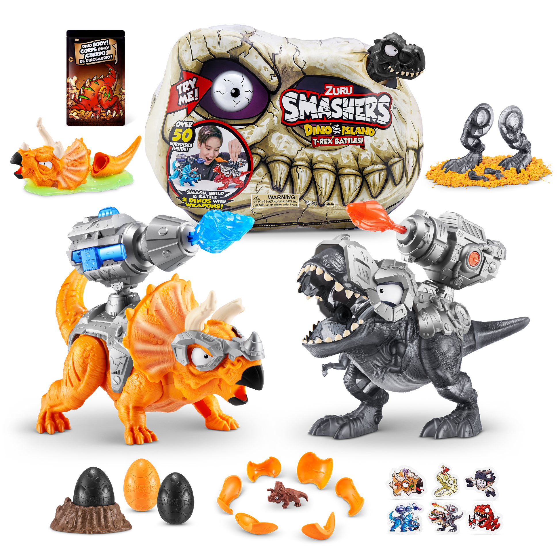 Are you ready for a prehistoric battle? Dig your way through sand and slime to discover your dinosaur pieces before constructing your 2 battling dinos. Secure their weapons and armor for the ultimate smashing battle. Smash the mini smash eggs to discover collectible characters and place the eyeball in a dino’s mouths for roar-some lights and sounds! There are over 50 surprises to smash, build and battle with Smashers Dino Island T-Rex Battles!